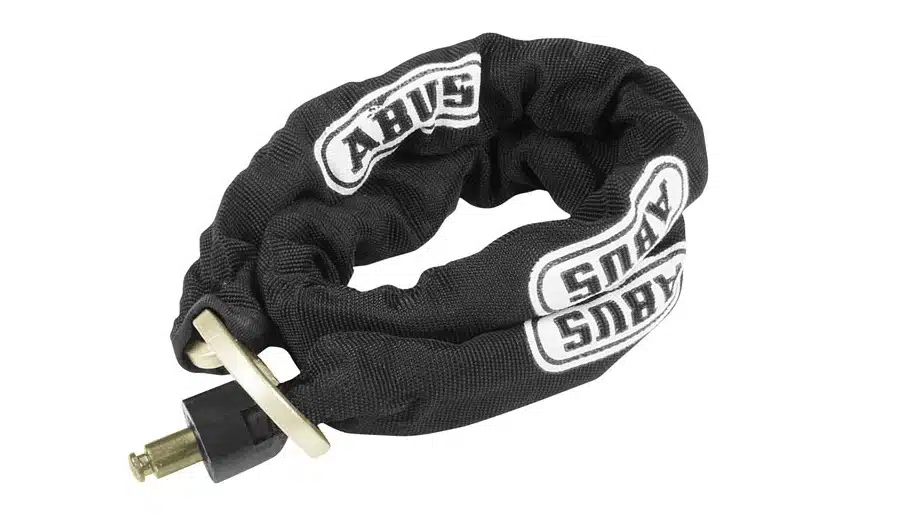 Stærk Abus Amparo kædelås i hærdet firkantet stål og med kraftigt stofovertræk er tilbehør til en fastmonteret Abus 4850 Amparo ringlås. Det slidstærke overtræk på låsen gør, at cyklen ikke ridses af kædelåsen.